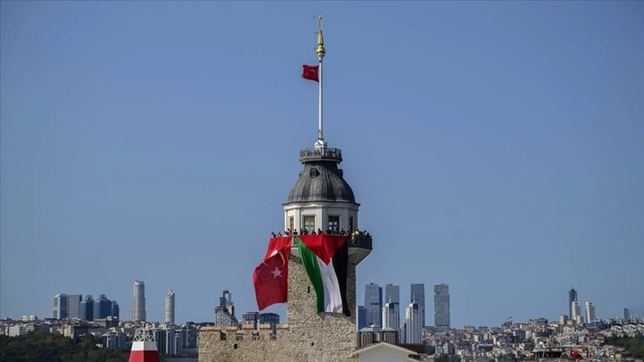 ????Karaköy’den hareket eden tekneler, Üsküdar Salacak açıklarına ulaştı. Burada denizde dev bir Filistin bayrağı açılırken, Kız Kulesi’ne de Türk ve Filistin bayrakları asıldı.