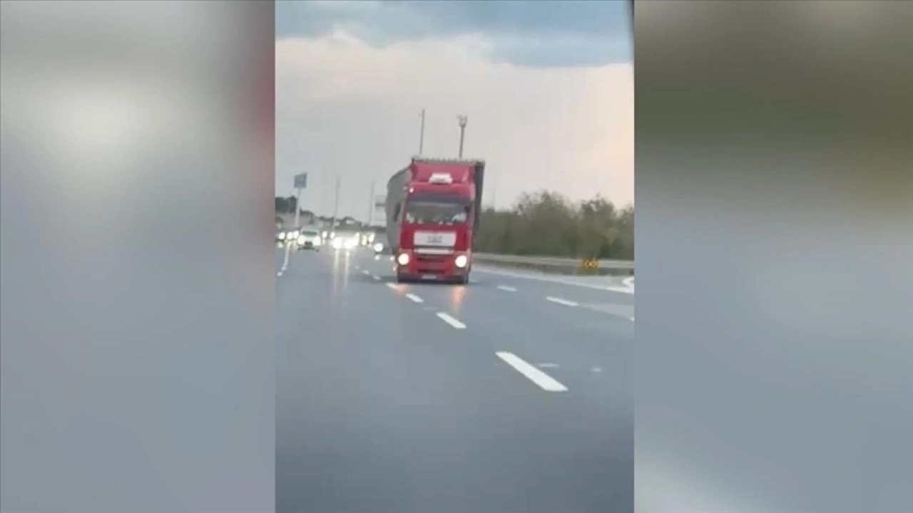 Tırın zikzak çizmesi ve dorsesindeki yüklerin yola savrulması, bir vatandaşın cep telefonu kamerasıyla kaydedildi. Görüntülerde, bazı otomobil sürücülerinin tırın önünü kestiği anlar da yer alıyor.