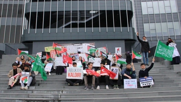 Boyunlarına kefiye takıp, ellerinde Filistin ve Türk bayrağı ile Kelime-i Tevhid yazılı bayrak taşıyan öğrenciler, Türkçe, İngilizce ve Arapça pankartlarla oturma eylemini sürdürdü ve Kur'an-ı Kerim tilaveti dinledi.