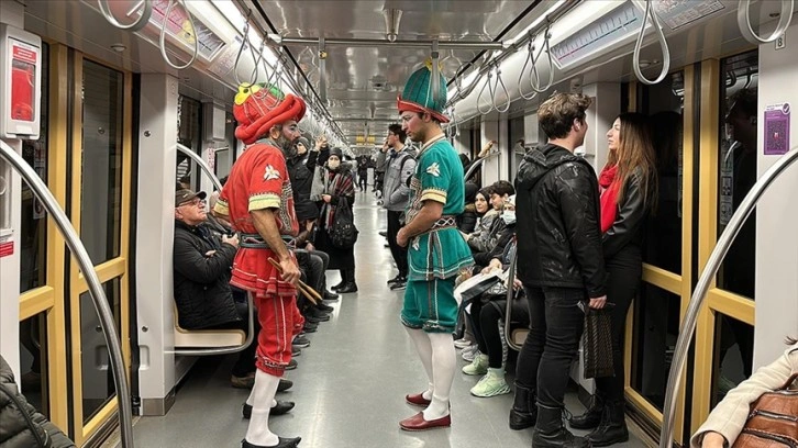 Karagöz gölge oyununu tiyatro performansına çeviren ekip, bugün M5 Üsküdar-Çekmeköy Metro hattında izleyenleri nostaljik bir yolculuğa çıkarttı.