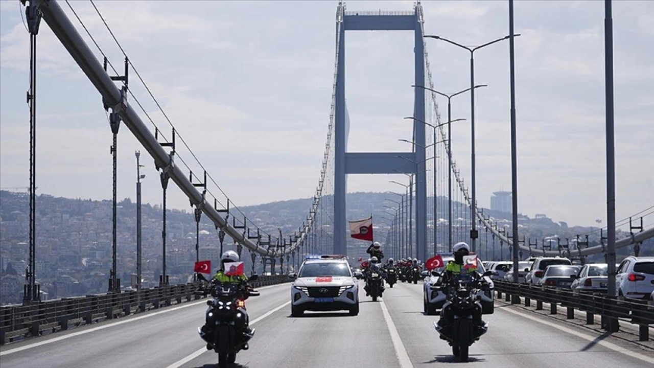 Havada bir polis helikopterinin de eşlik ettiği kortejdeki motosikletlerde Türk bayrağı ve Emniyet Genel Müdürlüğünün bayrakları yer alırken, ekip araçlarının önlerine de Türk bayrakları asıldı.