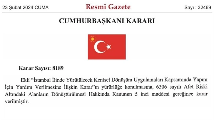 İstanbul'da yürütülecek kentsel dönüşüm uygulamaları kapsamında yapım için yardım verilmesine ilişkin Cumhurbaşkanı Kararı Resmi Gazete'de yayımlanarak yürürlüğe girdi.