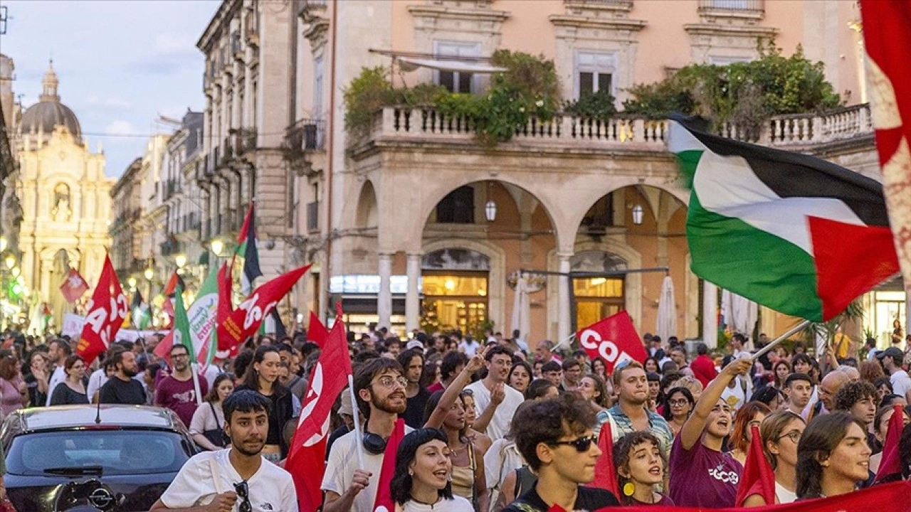 Küresel Sumud Filosu'na İtalya'dan katılacak teknelerin Sicilya Adası'nın doğusundaki buluşma noktalarından olan Katanya Limanı'nda bir araya gelen binlerce kişi, ellerindeki Filistin bayrakları ve Filistin'e, filoya destek belirten dövizlerle şehir merkezine doğru yürüdü.