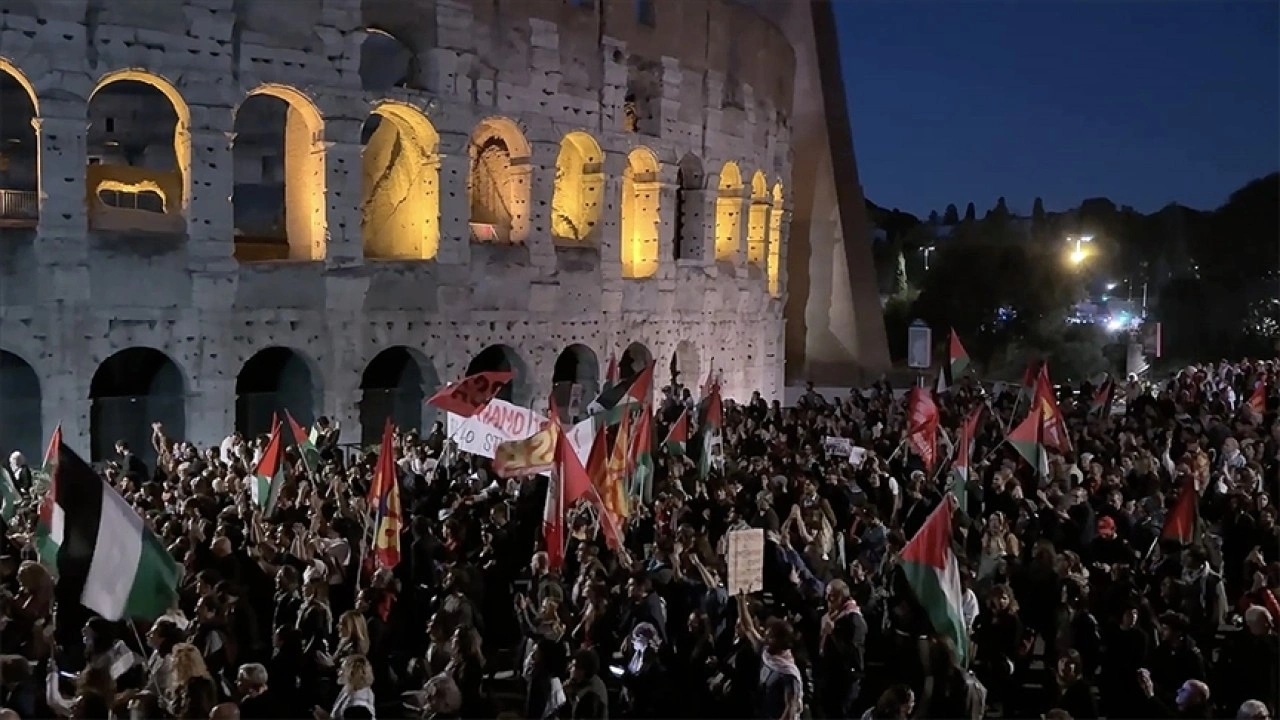 ????Roma'nın dünyaca ünlü simge yapılarından Kolezyum’da akşam saatlerinde toplanan binlerce kişi, "Her şeyi engelliyoruz" ve "Soykırım dursun" yazılı pankartların arkasından Piramide semtine doğru yürüyüşe geçti.