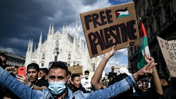 Şehir merkezindeki Duomo meydanında toplanan yaklaşık 3 bin kişi, İsrail'in Doğu Kudüs'teki ve Gazze Şeridi'ndeki Filistinlilere yönelik sert müdahale ve saldırılarına tepki gösterdi.
