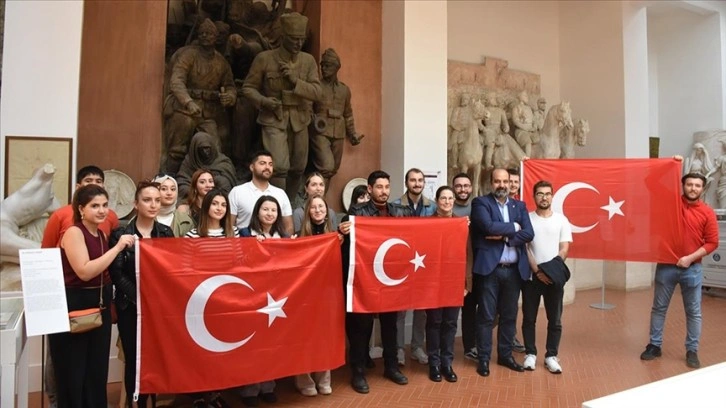 Öğrenciler, Sakarya Savaşı rölyefi önünde Türk bayrakları açarak, Müze Müdürü Scicchitano ve Kültür ve Tanıtma Müşaviri Haluk Söner ile de fotoğraf çektirdi.