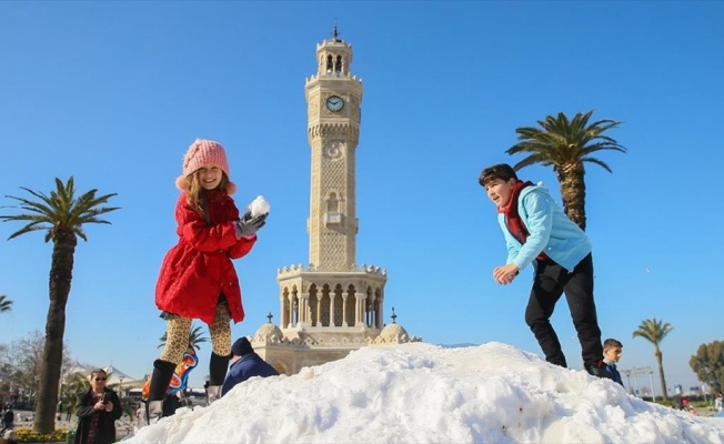İzmir Saat Kulesi önüne dökülen karları gören çocuklar sevinç yaşadı.