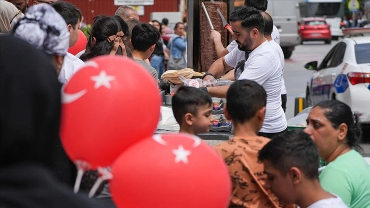 Cumhuriyet Meydanı'ndaki kutlama törenine katılan çocuklar, ekmek arası döner ve ayran ikramıyla sevinç yaşadı.