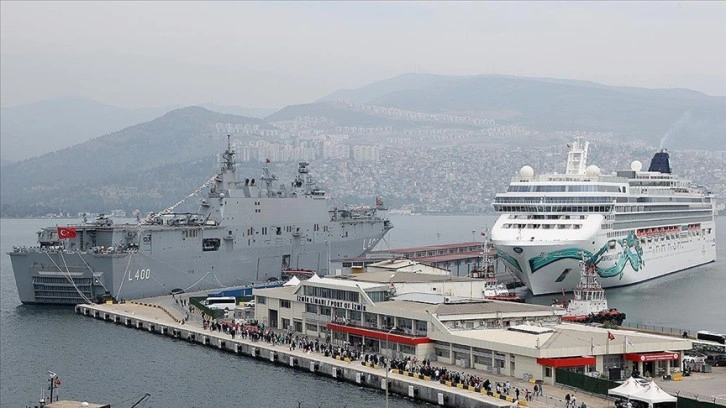 Hizmete 10 Nisan'da alınan, İstanbul'un ardından 3 Mayıs'ta İzmir'de vatandaşların ziyaretine açılan yerli ve milli üretim TCG Anadolu'yu görmek isteyen çok sayıda vatandaş, Alsancak Limanı'na geliyor.
