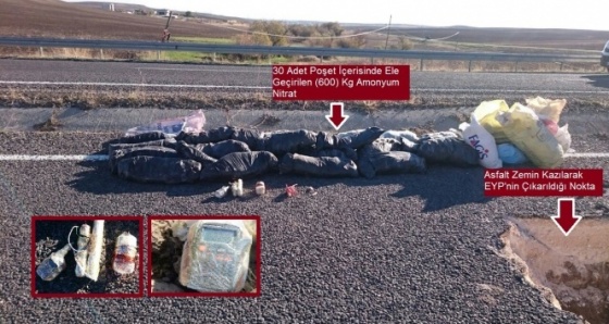 Jandarma ekipleri tarafından yolda yapılan mayın-EYP taramasında fark edilen patlayıcı alınan güvenlik önlemlerinin ardından olay yerinde imha edildi. Diyarbakır İl Jandarma Komutanlığı tarafından yapılan açıklamada, halkın can ve mal güvenliğinin alınması için çalışmaların aralıksız olarak devam edeceği belirtildi. Açıklamada, "Diyarbakır ili sınırları içinde faaliyet gösteren bölücü terör örgütünün son zamanlarda yapmış oldukları terör eylemleri, vatandaşlarımızın, ekonomik, sosyal faaliyetlerini yürütme ve seyahat etme haklarını kullanmalarını olumsuz yönde etkilemektedir. Diyarbakır İl Jandarma Komutanlığı tarafından; öncelikle vatandaşlarımızın can ve mal güvenliğinin sağlanması, mevcut huzur ve güven ortamının devam ettirilmesi, vatandaşlarımızın her türlü terör eylemlerinden korunması, seyahat etme haklarını rahatlıkla kullanması maksadıyla her türlü tedbir alınmaktadır. Bu tedbirler kapsamında Silvan ilçesi Sarıbuğday köyü mevkiindeki Diyarbakır - Silvan karayolunda icra edilen mayın/EYP araması esnasında; menfez ile asfalt zemin arasına yerleştirilmiş vaziyette 30 adet poşet içerisinde yaklaşık 600 kilogram amonyum nitrat, 3 adet elektrikli fünyeye bağlı 450 metre uzunluğunda kablo, 1 adet telsiz, 24 adet birleştirilmiş pil bloğu ve 1 adet TOL serisi devre kartına bağlı ve aktif halde EYP düzeneği tespit edilmiştir. Cumhuriyet Başsavcılığı'nın talimatıyla ele geçirilen EYP, Patlayıcı Madde İmha timi tarafından yerinde etkisiz hale getirilmiş, karayolunda oluşan hasar karayolları bölge müdürlüğünce tamir edilerek anılan karayolu ulaşıma açılmıştır. Bölgemizde yaşayan vatandaşların huzur ve güven içerisinde seyahat özgürlüğünü rahatlıkla kullanabilmesini sağlamak amacıyla teröristle mücadele kapsamında yürütülen faaliyetlere kararlılıkla devam edilmektedir" denildi.