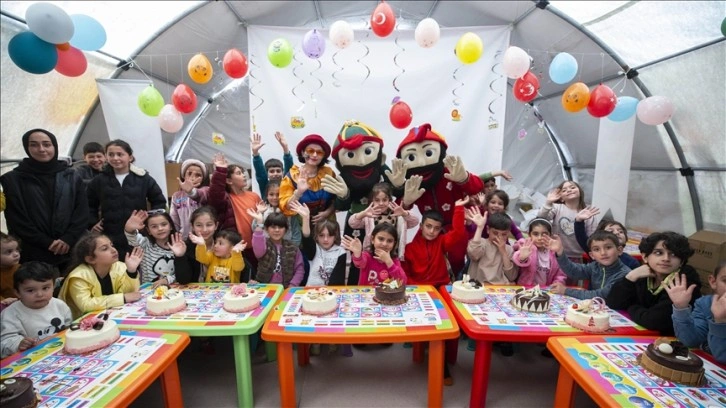 Çadırda, martta doğan ve depremler nedeniyle doğum gününü kutlayamayan 30 çocuk için sürpriz parti düzenlendi.