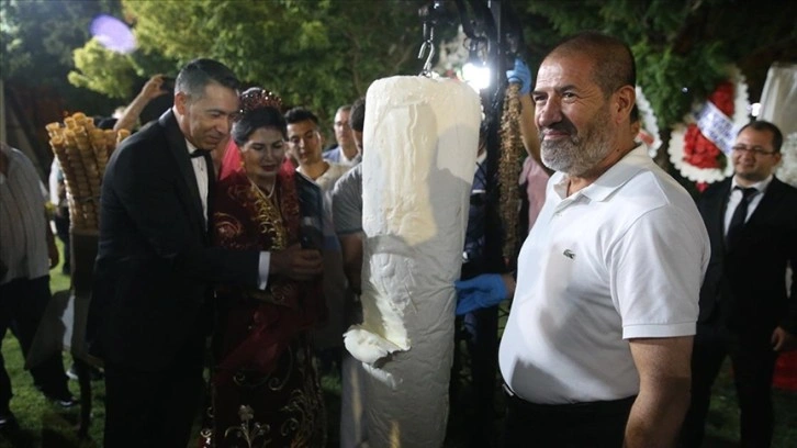 Nikahın kıyılmasının ardından, düğün salonuna getirilen 200 kilogramlık Maraş dondurması gelin ve damat tarafından satır ile kesildi.
