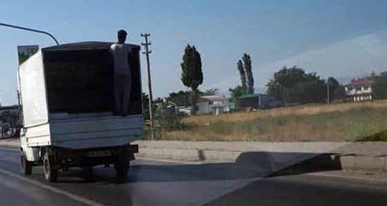 Edinilen bilgilere göre, 71 Evler kavşağında seyir halinde olan bir kamyonetin kasasına tutunarak yolculuk yapan vatandaş, adeta ölümle dans etti. Hiçbir güvenlik önlemi almayan ve en ufak bir dikkatsizlik sonucu düşebilme ihtimali olan şahıs, uzun süre bu şekilde yolculuğuna devam etti. Canını hiçe sayarak kasadan tutunan şahıs, yolda giden vatandaşlar tarafından korku dolu gözlerle izlendi. Tehlikeli yolculuğu izleyen sürücüler, kamyonun arkasına çok fazla yanaşmamaya özen gösterdi.