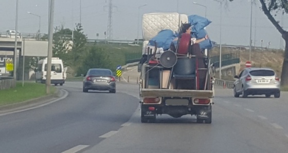 Bursa'nın en işlek caddelerinden biri olan Mudanya Bulvarı'nda seyir halindeki kamyonetin kasasındaki genci görenler şaşkına döndü. Eşyaları kamyonetin kasasına yükleyen sürücü ve yanındakiler, kabinde yer kalmadığı için gencin kasaya binmesini istedi. Kasada yolculuk yapan genç ise, güvenliğini eşyaların bağlandığı urganın arkasına geçerek sağladı. Kamyonetin hızlı olması sebebiyle rüzgardan etkilenen genç, eşyaları kendine siper etti.
