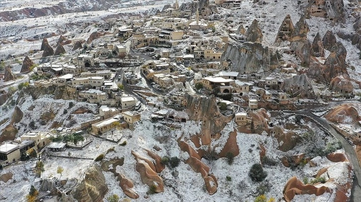 Yaklaşık 3 saat süren kar yağışının ardından UNESCO Dünya Mirasları Listesindeki Kapadokya'da peribacaları ve doğal kaya oluşumlu vadiler, kar yağışının ardından karla kaplandı.