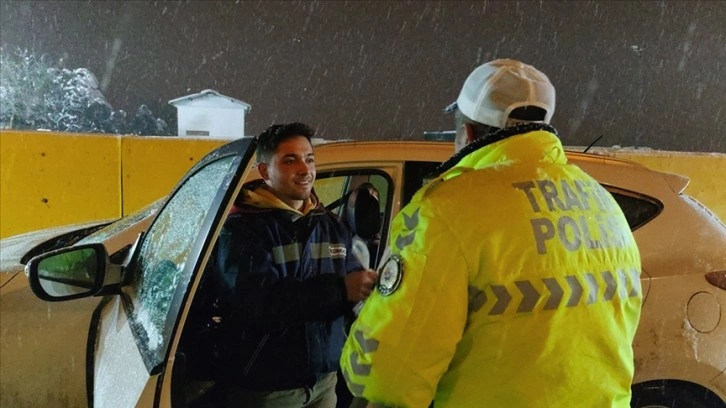 Bursa-Ankara kara yolu İnegöl ilçe girişinde etkili olan kar yağışının zaman zaman şiddetini artırması sürücülere zor anlar yaşatırken, İnegöl Emniyet Müdürü Erdoğan Baydemir'in talimatı ile polis ekipleri tarafından sürücülere simit ve çay ikramında bulunuluyor.
