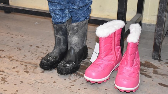 Birçok çocuğun ayağındaki kara lastikleri çıkartan gönüllü ekip üyeleri, onları sıcak botla buluşturmanın mutluluğunu yaşadı.