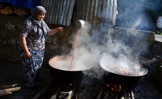Giresun'un Yağlıdere ilçesinde yaşayan ve yılın büyük bölümünü bahçelerde geçiren ev hanımları, üzümden pekmez, mısırdan un, fasulyeden turşu ve tuzlama hazırlıyor.