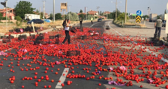 Konya'nın Ereğli ilçesinde kontrolden çıkan domates yüklü tır karşı şeride geçerken savrulan kasalarla karayolu adeta domates tarlasına döndü.
