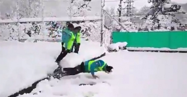 PTT 1. Lig’de mücadele eden Giresunspor’da oyuncular, ilginç bir kar şovu yaptı.Yan yana dizilen 7 yeşil beyazlı oyuncu, adeta domino taşları gibi kar yığınına devrildi, ortaya renkli görüntüler çıktı.(İHA)