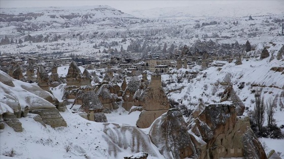 Milyonlarca yıl önce Erciyes ve Hasandağı'nın püskürttüğü lav ve küllerin oluşturduğu yumuşak tabakaların, asırlar boyu yağmur ve rüzgar tarafından aşındırılmasıyla ortaya çıkan peribacaları ve doğal kaya oluşumları, kar yağışının ardından beyaza büründü.