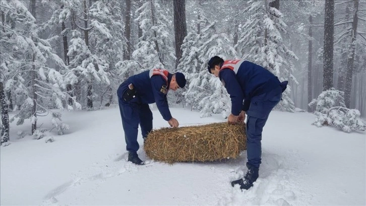 Karla kaplı Kazdağları'nda kış aylarında yiyecek sıkıntısı yaşayan yaban hayvanlarının zorlu şartlarda aç kalmasını önlemek ve yerleşim merkezlerine inmesinin önüne geçmek amacıyla belirlenen noktalara yem konuldu.