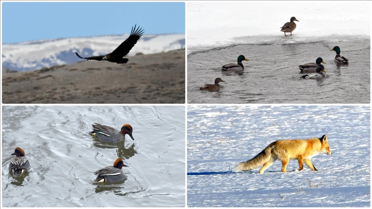 Toplu olarak bir süre tarlada konaklayan akbabalar daha sonra uçarak gözden kayboldu. Buzları çözülen Kars Çayı'nda ise çamurcun ve yeşilbaş ördekler beslenmeye çalıştı.