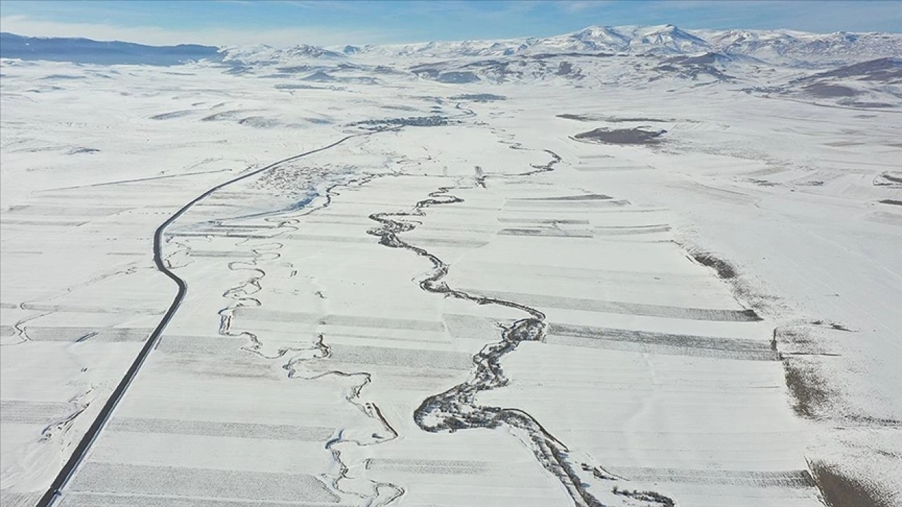 Beyazla kaplanan arazilerde görsel güzellik sunan menderesler dronla görüntülendi.