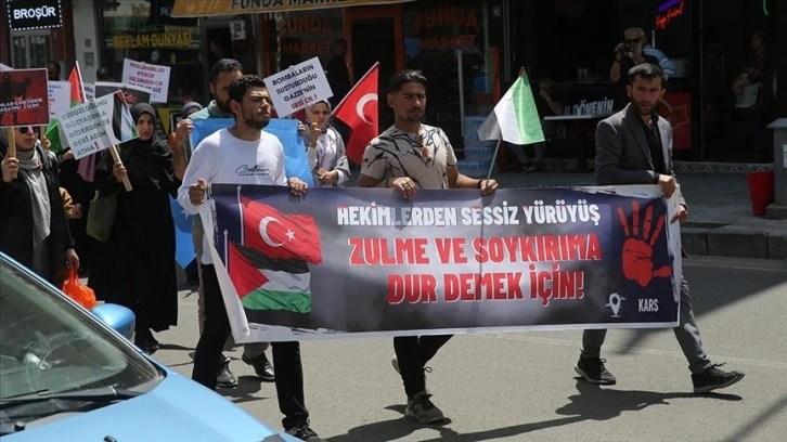 Fethiye Camisi'nin önünde bir araya gelen sağlık çalışanları ve tıp fakültesi öğrencileri, taşıdıkları dövizler, Türk, Filistin ve Doğu Türkistan bayraklarıyla Gazi Ahmet Muhtar Paşa Caddesi'nden yürüyüşe başladı.
