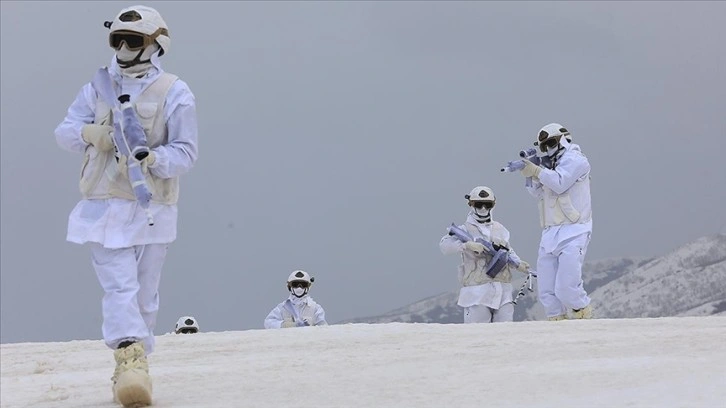 Sorumluluk alanlarındaki dağlarda ve kırsalda "ara bul, yok et" prensibiyle teröristlere yönelik operasyon yapan komando timi, karla kaplı bölgelerde ve zorlu arazi ile iklim koşullarına rağmen görevini kararlılıkla sürdürüyor.