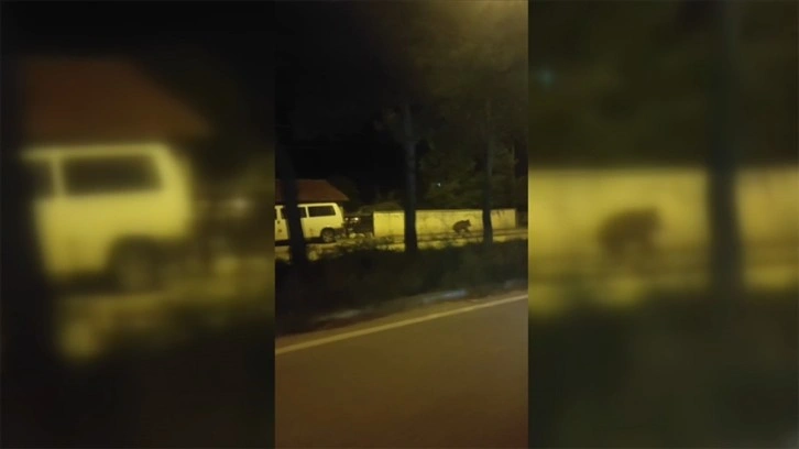 Ormanlık alandan gece saatlerinde Sazyaka Mahallesi'ne gelen ayı, bir süre yol kenarında koştuktan sonra gözden kayboldu.