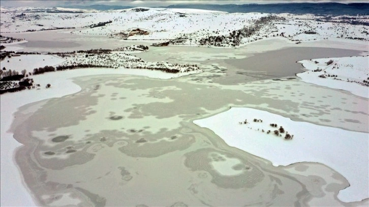 Kastamonu'nun Devrekani ilçesinde etkili olan soğuk hava nedeniyle Kulaksızlar Barajı'nın yüzeyi buzla kaplandı.