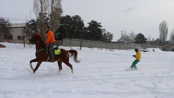 Erzincan'da yoğun kar yağışını eğlenceye dönüştüren kayakçılar, cirit atlarına bağladıkları iplere tutunarak "atlı board" yaptı.