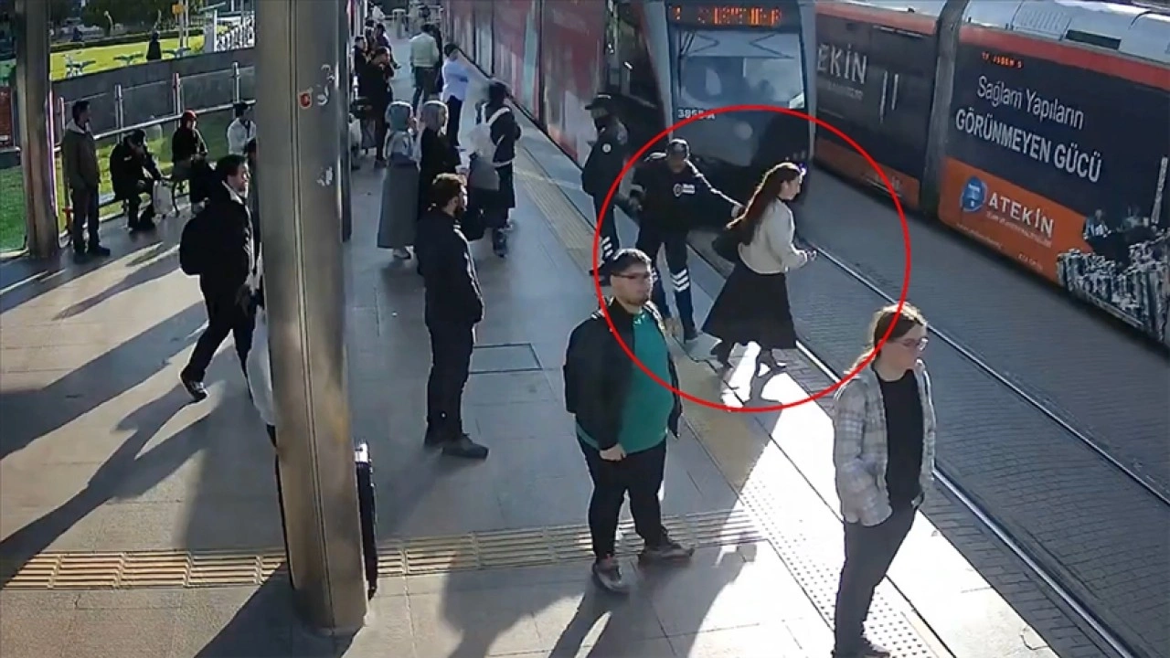 ????Durak ve tramvayın güvenlik kamerasınca kaydedilen görüntüde, güvenlik görevlisinin kolundan tuttuğu yolcuyu geri çekerek tramvayın çarpmasını engellediği yer alıyor.