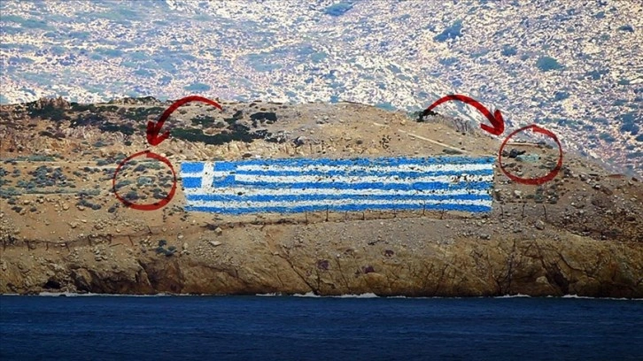 Uluslararası antlaşmalara göre, Onikiadalar'ın hukuki statüsü dışında bırakılan, yerleşime kapalı ve silahsız olması gereken Keçi Adası'na çizilen Yunan bayrağı da dikkati çekiyor. Bayrağın her iki yanında, üstleri kamufle edilen siperlerdeki topçu bataryaları rahatlıkla görülüyor.