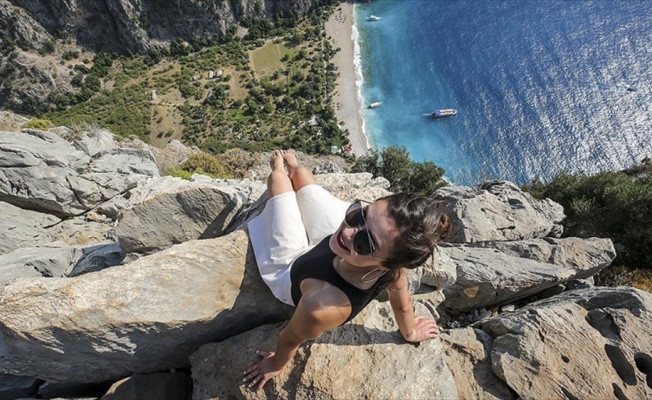 Muğla'nın Fethiye ilçesindeki Kelebekler Vadisi’nin kayalıklarına çıkan turistler, tehlikeye aldırış etmeden uçurumun kenarında fotoğraf çektiriyor.