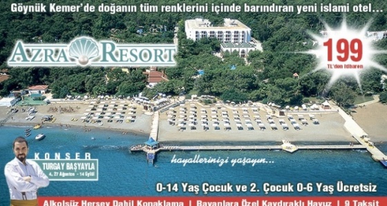 Antalya Kemer’de bulunan Azra Resort Otel İslami hassasiyeti olan misafirlerine, bir tatilde yapmayı hayal ettikleri her şeyi yaşatma sözü veriyor. Hem ailenizle; hem de tek başınıza huzurlu bir tatil geçirmek istiyorsanız kesinlikle Azra Resort Otel..