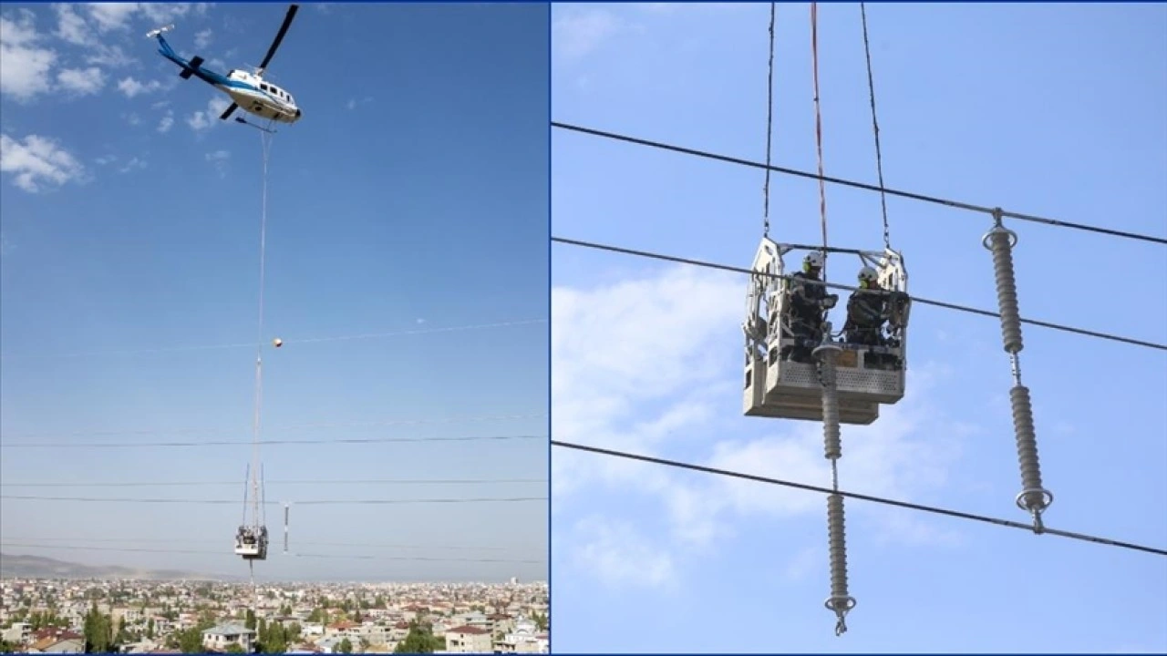 İzole malzemeler ile saf gümüş liflerden imal edilen özel iletken kıyafet giyen görevliler, hazırlıkların ardından halatla helikoptere bağlanan çelik sepete girerek metrelerce yükseklikteki hatlarda çalışma yürüttü.