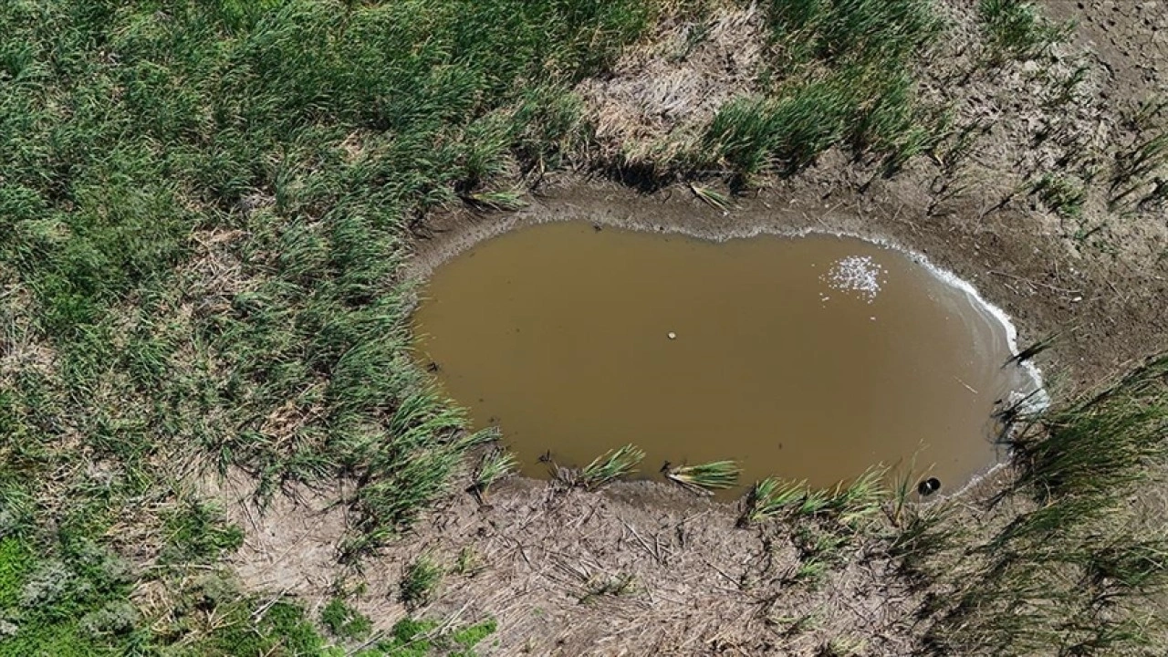 Merkeze bağlı Karakoç köyünde merada otlayan hayvanların sulaması için kullanılan göletin su seviyesi, hazirandan itibaren aşırı sıcaklık nedeniyle düşmeye başladı.