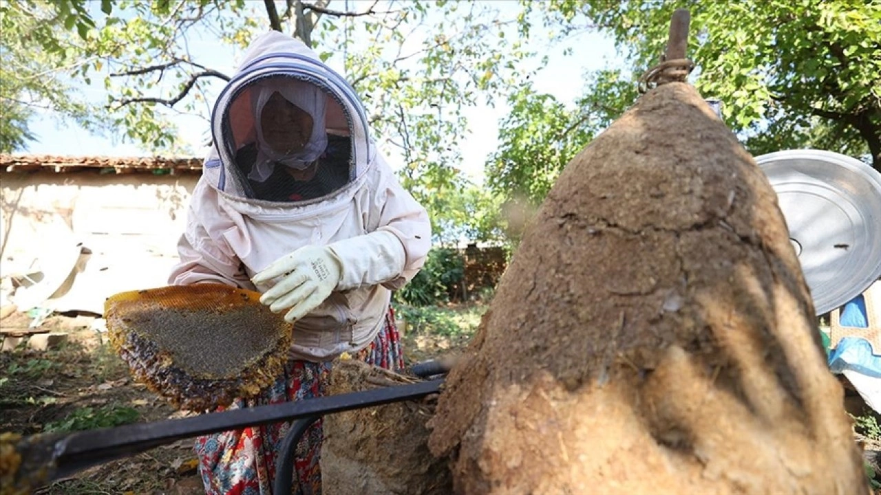 Kuştepe köyünde evinin bahçesinde konik sepetlerle bal üreten Gürses, bugünlerde yoğun bal mesaisine devam ediyor.