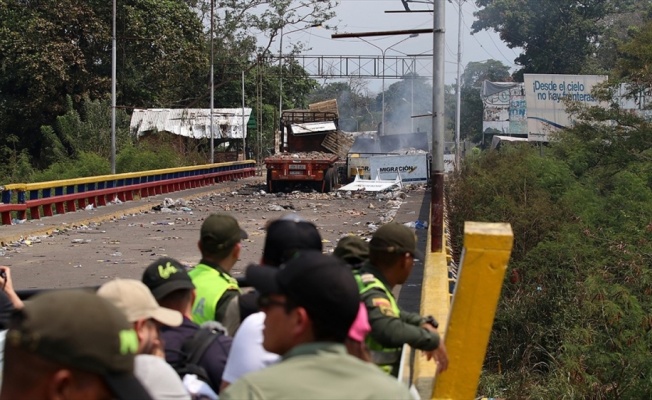 Cucuta'nın kuzeyinde, önceki gün yakılan tırlardan halen dumanların yükseldiği diğer sınır kapısı Francisco de Paula Santander Uluslararası Köprüsü'ne ise yalnızca iki gösterici çıktı. Köprünün altındaki 10 kişilik grubun da taş atması üzerine Venezuela güvenlik güçleri köprüye girdi.