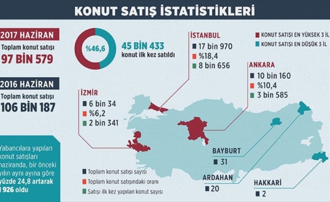 Buna göre, ülke genelinde haziranda satılan konut sayısı, bir önceki aya göre yüzde 16,3 geriledi. Konut sayısı geçen yılın aynı ayına göre ise yüzde 8,1 azalarak 97 bin 579 oldu.