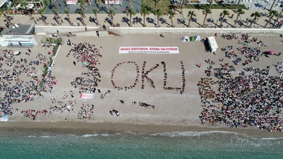 Proje kapsamında Konyaaltı ilçesindeki anaokul, ilkokul ve ortaokulda öğrenim gören 15 bin öğrenci ile birer velisi Konyaaltı Plajı'na ellerinde kitapları ile geldi.