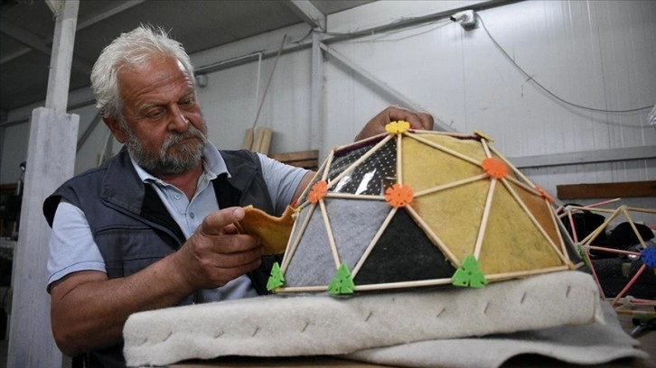 Yaklaşık 20 yıldır koyun yünü ve keçi kılı üzerine çalışmalar yürüten Polat, geri dönüşümden ve doğal ürünlerden elde ettiği malzemelerle jeodezik (bir çeşit küre) çatı modelini yorumlayarak, kurulumu kolay ergonomik çadır üretti.