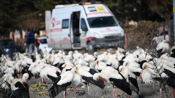 Konya'ya inen leylekler belediye ekiplerince balıkla besleniyor