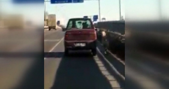 Cep telefonu kameralarına yansıyan görüntülerde ise, 4’lü sinyallerini yakan kırmızı renkli bir otomobilin yaklaşık 20 kilometre hızla ilerlediği görülüyor. Aracın sağ dikiz aynasına iple bağlanan köpek ise araçla birlikte trafikte ilerliyor. Görüntüyü çeken vatandaş yaklaşık 15 saniye olayı çektikten sonra öndeki aracın yanına yaklaşarak “Beyefendi hiç hoş değil, hem de hiç” diye sesleniyor. Köpeği aracına bağlayarak koşturan vatandaş ise “Bir yerden bulduk eve götürüyoruz, arabaya koyamadık ısırıyor” diyerek kendisini savunmaya çalışıyor. Bu sırada araç ile birlikte koşan köpeğin kilometrelerce kat etmesinden dolayı hayli yorulduğu da gözleniyor.