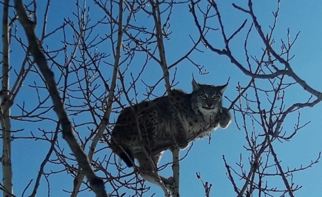 Gümüşhane’de köpekten korkarak kaçan vaşak, kavak ağacına tırmandı.