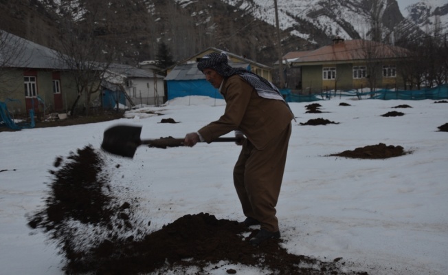 Yaz aylarında daha fazla verim almak isteyen köylüler, yaklaşık bir metrelik karın altında tarla ve bahçelerde çalışmaya devam ediyor.