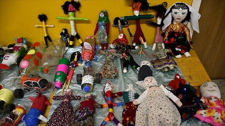 Sivas'ta 3 köy okulunun ortaklaşa hayata geçirdiği "Atmıyorum, Topluyorum, Tasarlıyor ve Oynuyorum Projesi" kapsamında ilkokul öğrencileri, hayal güçlerini kullanarak geri dönüştürülebilir materyallerden oyuncak yapıyor.