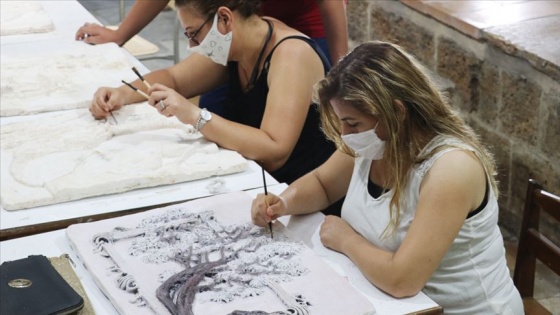 Mersin'de kültür ve sanat evine dönüştürülen 117 yıllık tarihi Hadra Hamamı'nda açılan heykel kursunda kadınlar, ellerinde şekillendirdikleri taşlara kabartma tekniğiyle kentin eski evlerini işliyor.